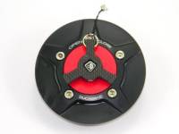 Ducebike billet fuel cap. Includes Carbon fiber key for removing lid. Available with black base and one of four colors for the top. Includes base, lid, key and carbon key.