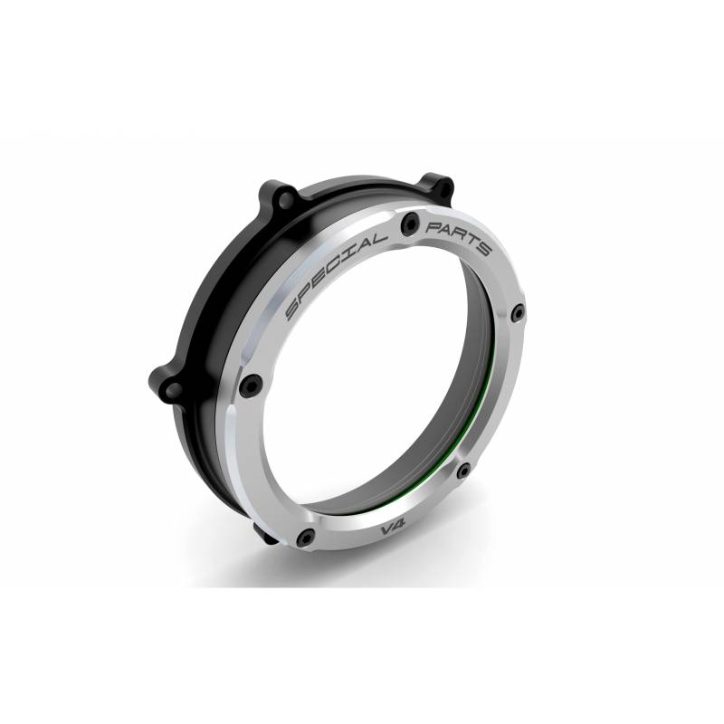 Ducabike Ducati Streetfigher V4 complete wet clutch cover with clear lens, pressure plate and pressure plate ring. The cover is a very unique item that is only manufactured by Ducabike in this particular style. The base is CNC machined from a single block of aluminum then anodized. Choose between different colors available