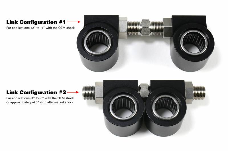 Window Link is ‘convertible’ to provide adjustment range potential from +2” to approximately -4.5” (modification and/or aftermarket shortened shock required)