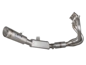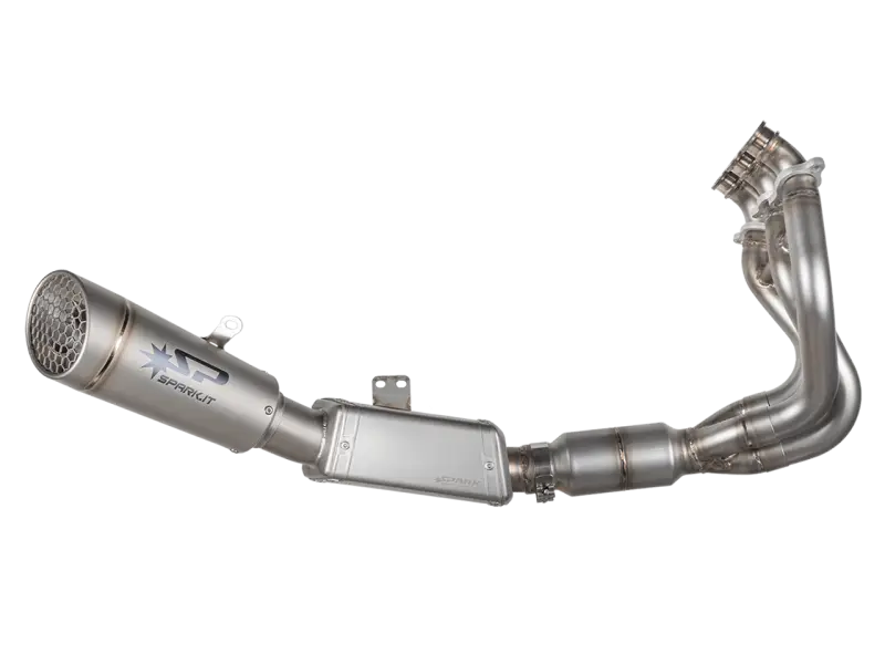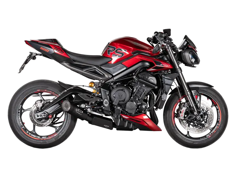Spark Exhaust Triumph Street Triple 765 R/RS "Grid-O" Euro 5 Exhaust System with Black Ceramic Treatment. Titanium silencer with AISI-304 stainless steel link-pipe, high-flow racing catalyst, pre-silencer box and stainless racing headers. Spark R&D has worked intensively on the new 3-cylinder engine by Triumph in Moto2. The experience gained on the racetrack allowed for the optimization of collectors' diameters and length of the English naked motorbike so as to get top performance. Designed with CNC turned bushings on the couplings and compensators 3>1 crossover with two (2) lambda bug holes. The exhaust has a deep sound that celebrates the Triumph's signature triple. Handcrafted in Italy. Ultra-light approximately 5.9 kg. (vs. OEM 9.6 kg.) Dyno Tested for maximum horsepower increase over stock. Euro 5 Homologated Racing Version for Maximum Performance. *Includes removable DB Killer.