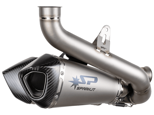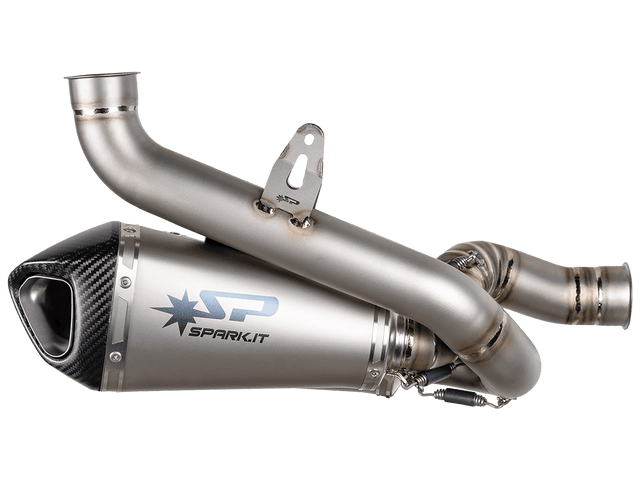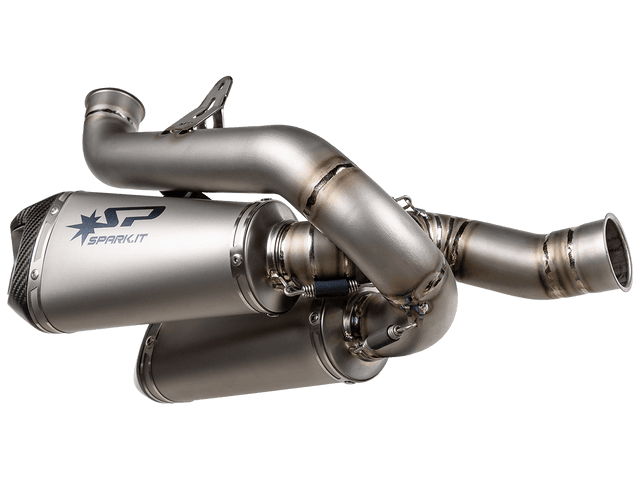 Spark Exhaust Ducati Streetfighter V4 S/R "Double Konix Evo" Titanium Slip-On Exhaust System (2025+). After extensive research for maximum performance and sound coupled with development experience gained in WSBK - Spark presents a slip-on system developed to fit perfectly within the overall dimensions of the original side and lower fairings maintaining the harmony of Ducati's lines and ensuring complete compatibility. Its compact volume has been optimized to achieve a deep, aggressive, yet understated sound, with an ideal balance between comfort, tone, and racing identity. Ducati Panigale V4 exhausts are handcrafted in Italy. Non-Homologated Racing Version for Maximum Performance. For perfect performance, throttle response and durability, ECU remapping is required. Includes Removable DB Killers SP-G99125 + SP-G99133.